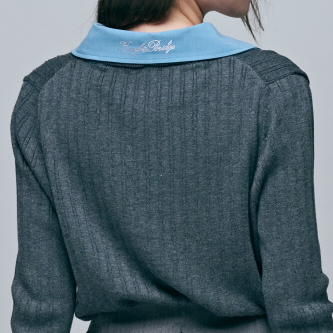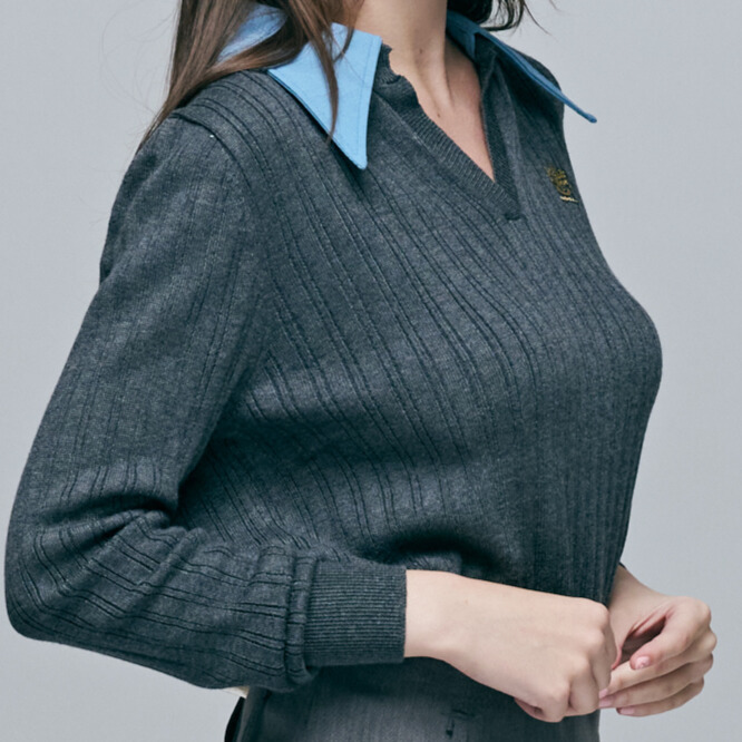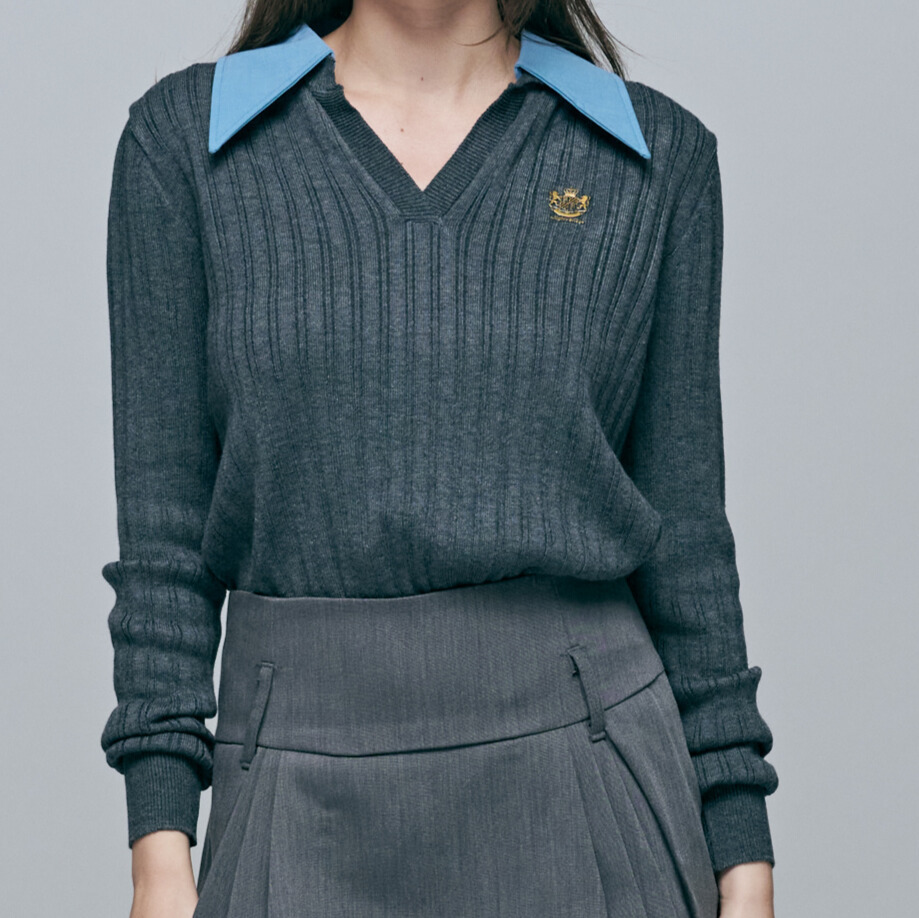 47%人造絲親膚細緻紗線 / 假兩件撞色襯衫領 / 顯瘦羅紋緹花組織 / 雙獅立體刺繡與後領鑽飾