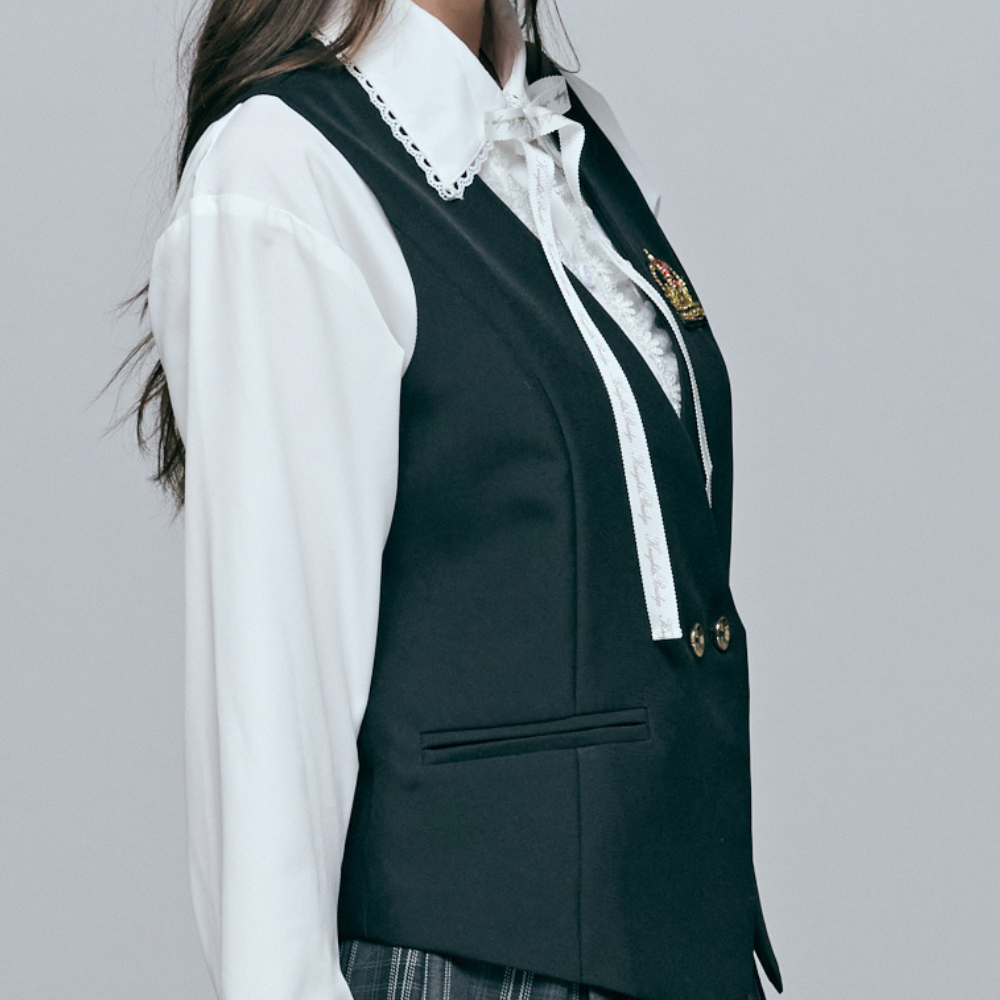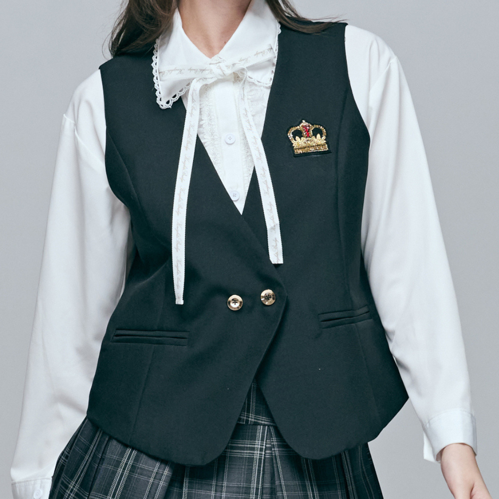 Royal Crown Badge 皇冠徽章:左胸口車縫了精緻的立體皇冠徽章,金線與紅絲絨的配色增添了高級感,是整件背心的靈魂所在,展現純正的英倫貴族氣息。