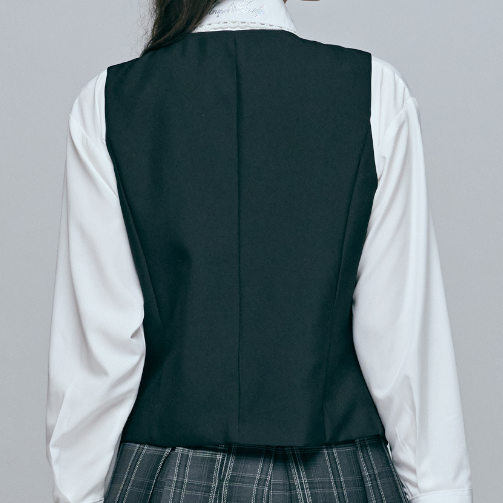 Double-Breasted Gold Buttons 小雙排金釦:門襟採用小雙排金釦設計,金屬光澤點亮了深色布料,不僅增添了年輕活潑的氣息,V 型的排列更有收縮腰身的視覺效果。