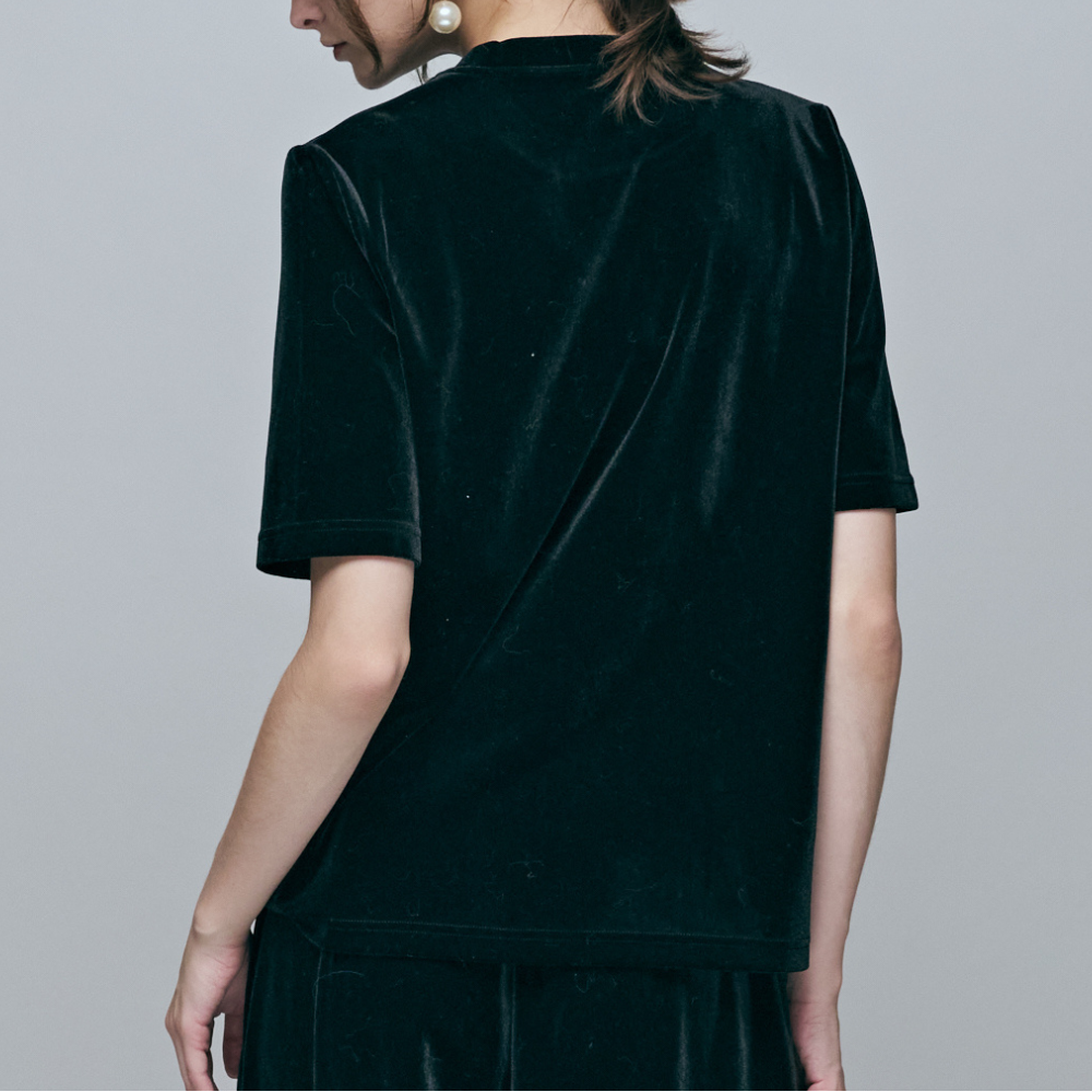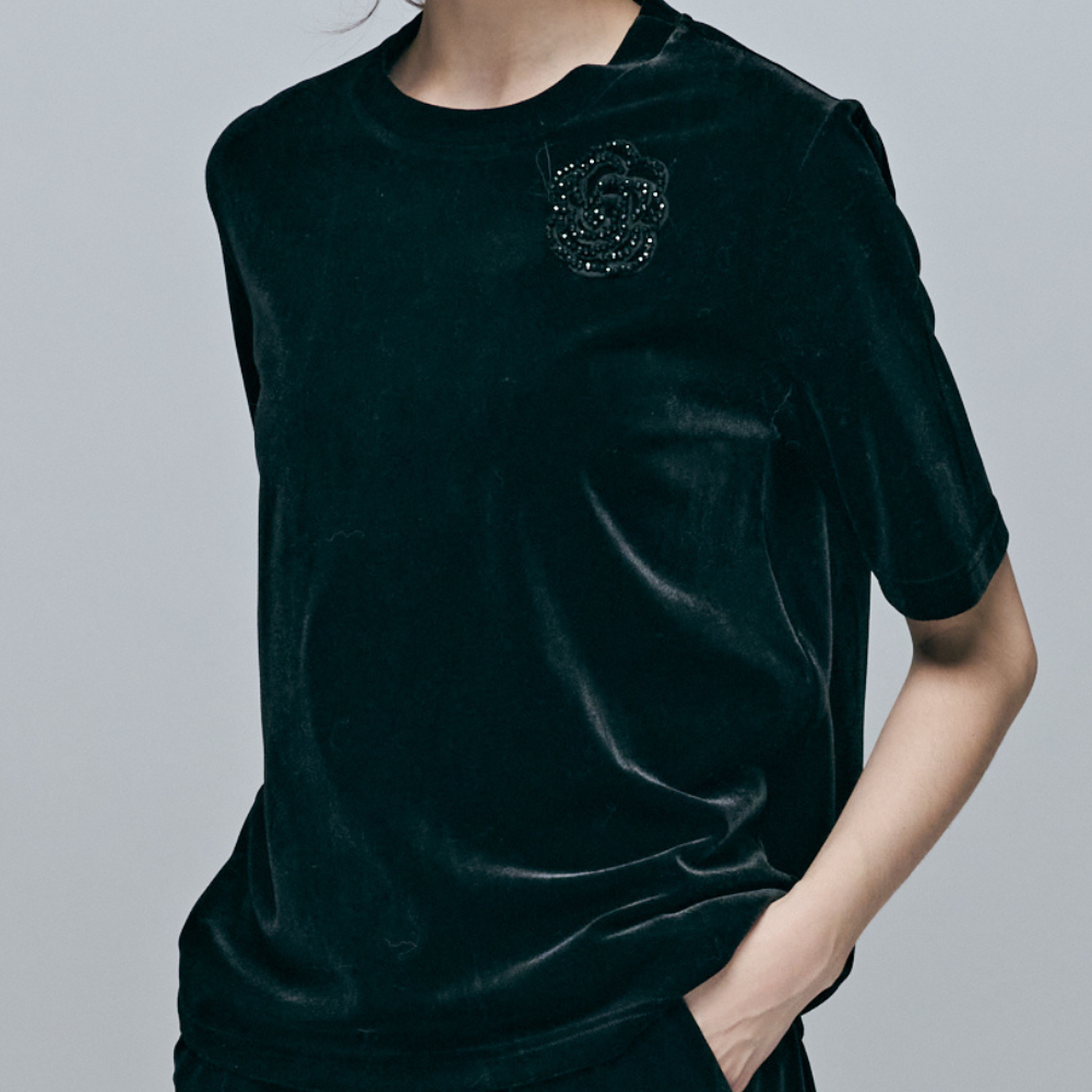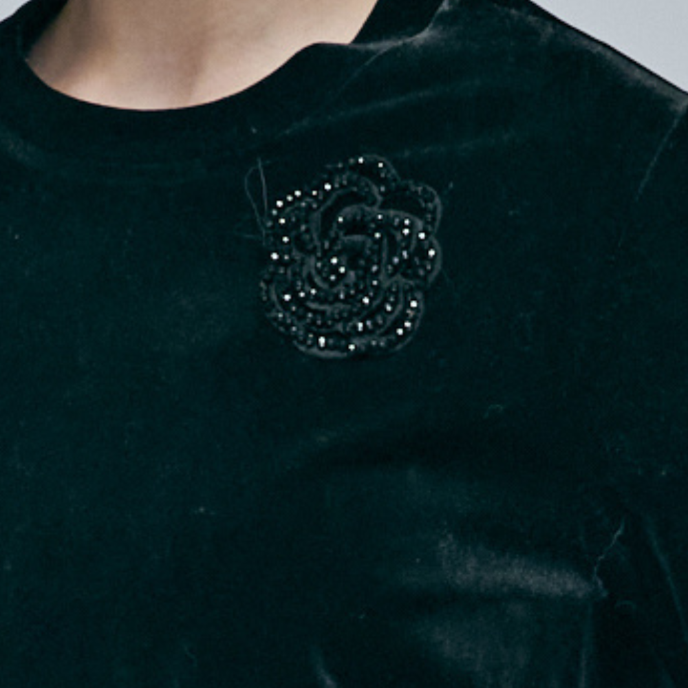 95%聚酯纖維彈性絲絨 / 顯瘦直身剪裁版型 / 精緻同色立體玫瑰珠花 / 低調奢華黑色光澤 / 可搭配同系列下身