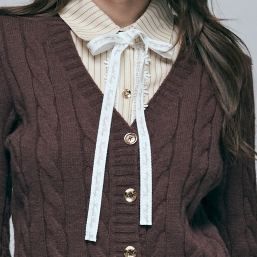 暖親膚包芯紗 / 經典立體拐麻花織紋 / 假兩件條紋襯衫領設計 / 附品牌LOGO織帶蝴蝶結