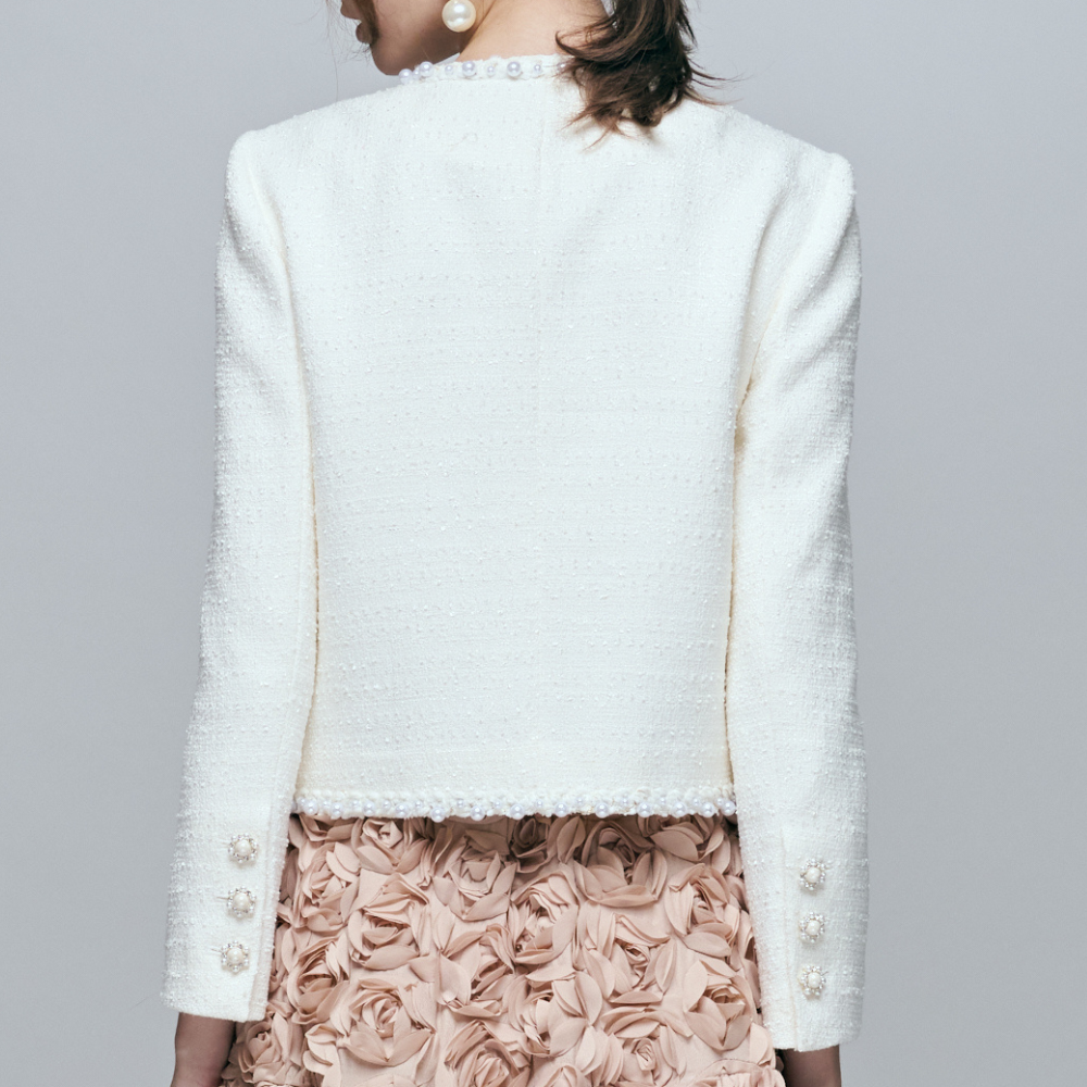 這款外套專為追求質感的女性設計。米白色的布料帶有微光澤的編織紋理,散發出優雅的氣場。領口、門襟與口袋處皆點綴了圓潤的珍珠滾邊,將視覺亮點聚焦,營造出如藝術品般的奢華氛圍。