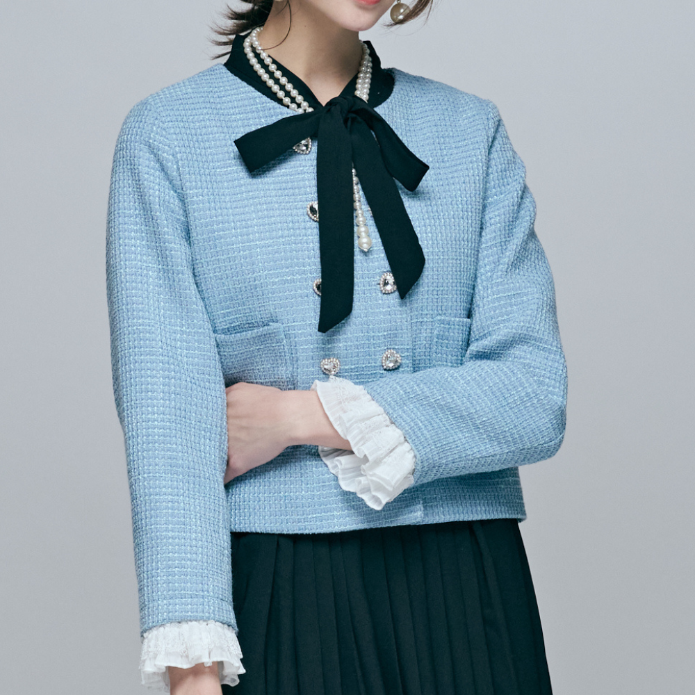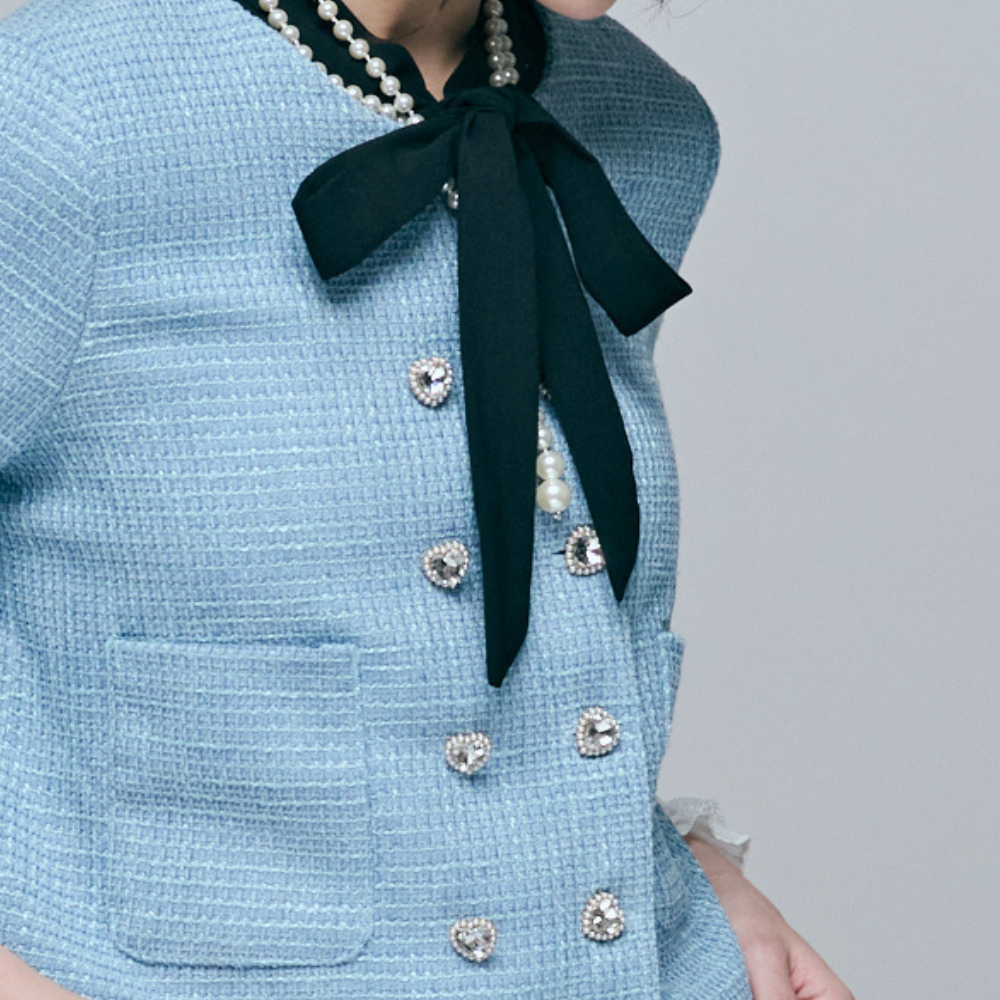 92%聚酯纖維吸濕排汗花呢 / 甜美雙排愛心造型鑽釦 / 宮廷風蕾絲荷葉袖口 / 顯瘦短版剪裁 / 氣質水藍色 (附黑色領結)