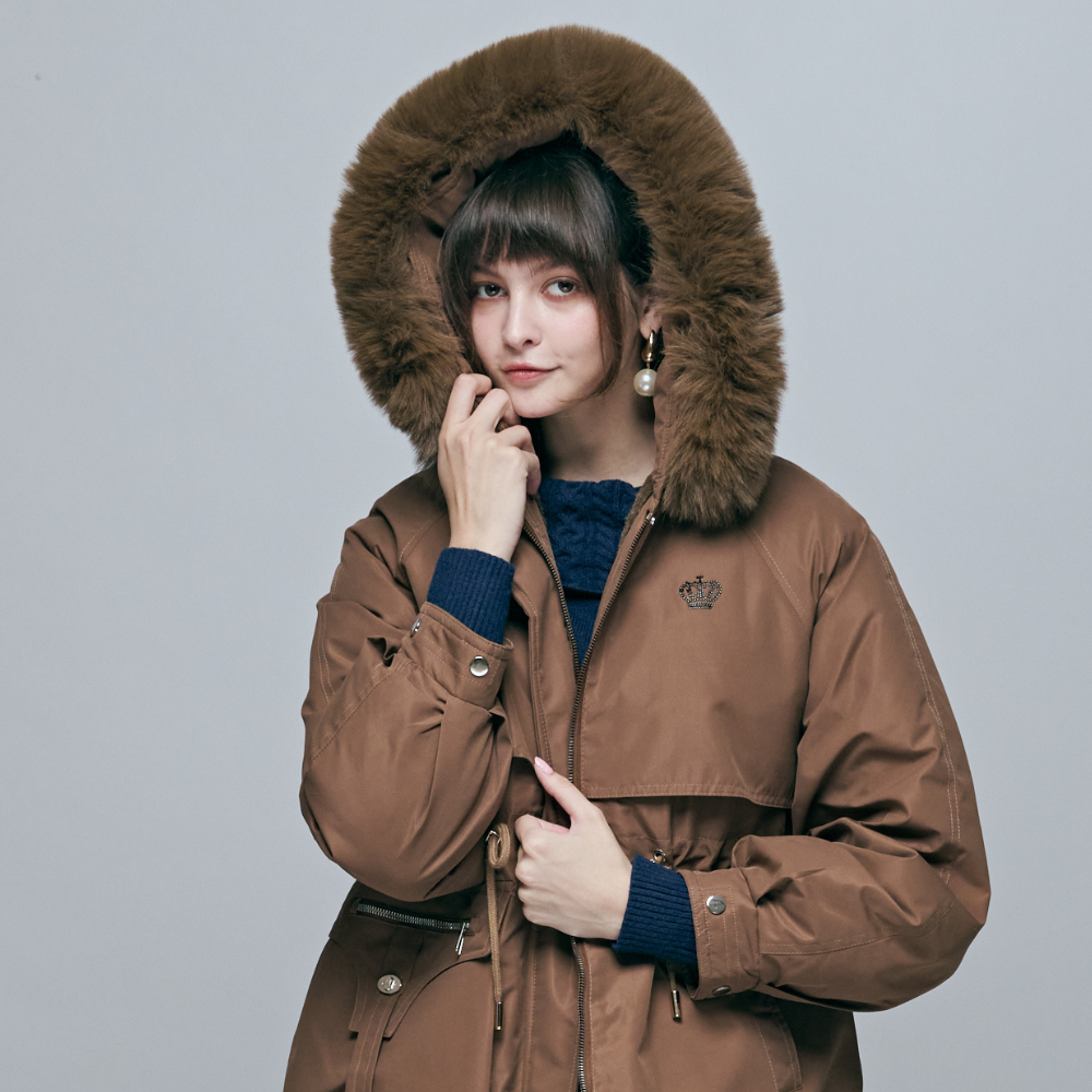 這是一件兼顧保暖與時尚比例的機能型短大衣。精緻的豐盈可拆式毛領襯托臉部線條,搭配可調節的抽繩縮腰設計,瞬間擺脫冬日臃腫感。胸前點綴 KB 專屬皇冠刺繡,在帥氣的工裝剪裁中注入品牌專屬的高級質感。