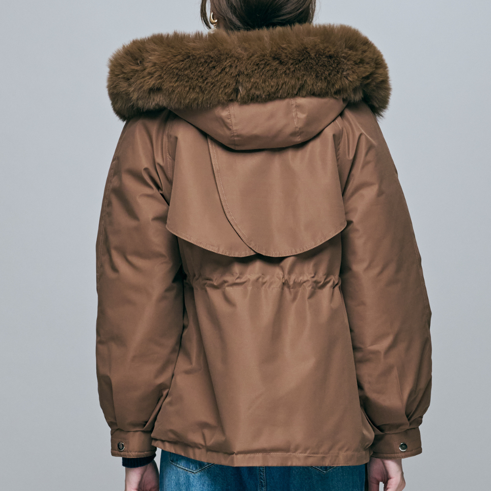 KB 本季推出的這款連帽外套,將機能實穿與都會時尚完美融合。採用帶有絲緞光澤的防風材質,溫暖的焦糖棕色調不僅襯托膚色,更為冬日穿搭增添一股溫潤氣息。