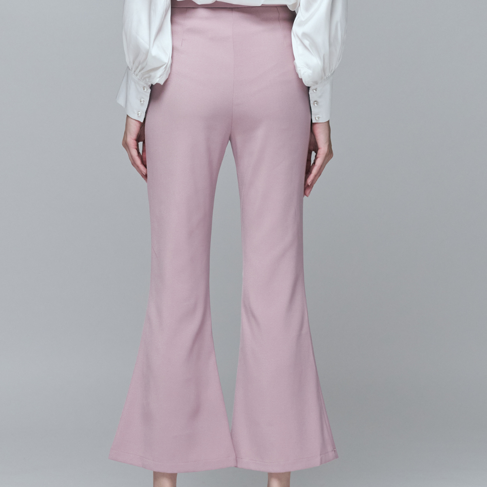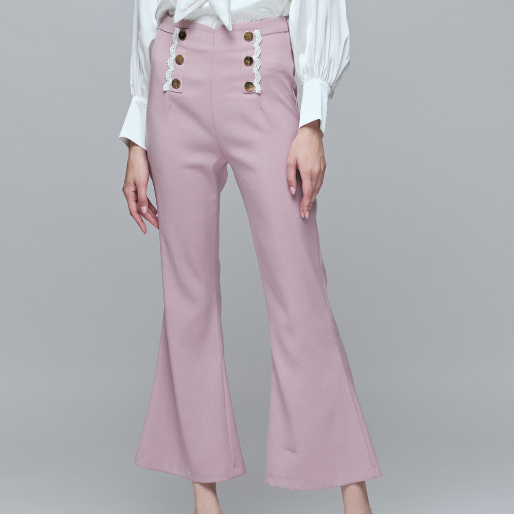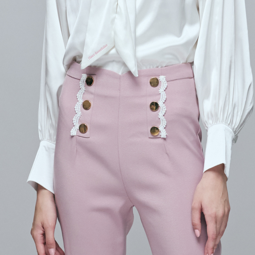 100%聚酯纖維挺闊面料 / 顯瘦高腰喇叭版型 / 甜美月牙型蕾絲拼接 / 精緻雙排金釦裝飾 / 視覺長腿神褲