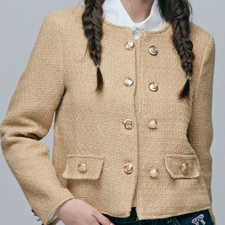 Tweed Elegance 優雅花呢:選用高質感的交織粗細花呢紗,透過不同粗細的紗線交織出豐富的立體紋理,溫暖厚實,自帶貴族千金的氣質。