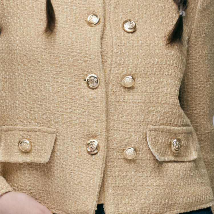 Military Chic 帥氣軍裝:融入帥氣的軍裝雙排釦元素,搭配精緻的金色浮雕鈕釦,在溫柔的花呢材質中注入一股俐落的英挺感。