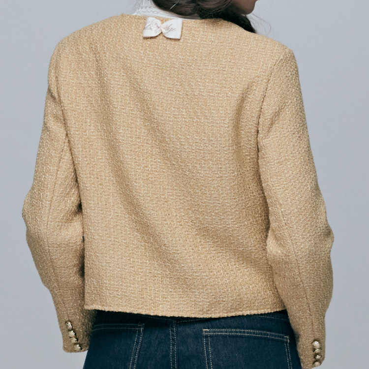 Sweet Surprise 背後亮點:後領處藏有品牌標誌性的 LOGO 織帶蝴蝶結,轉身時隱約可見,為帥氣的軍裝風格增添一絲甜美驚喜。