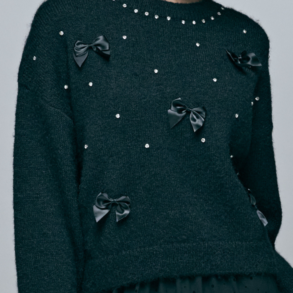 3D Satin Bows 立體蝴蝶結:衣身點綴著數個 同色系立體緞帶蝴蝶結,採用 緞面材質 增添光澤感。這種「黑色 on 黑色」的設計,讓甜美元素變得更加高級、不顯幼稚。