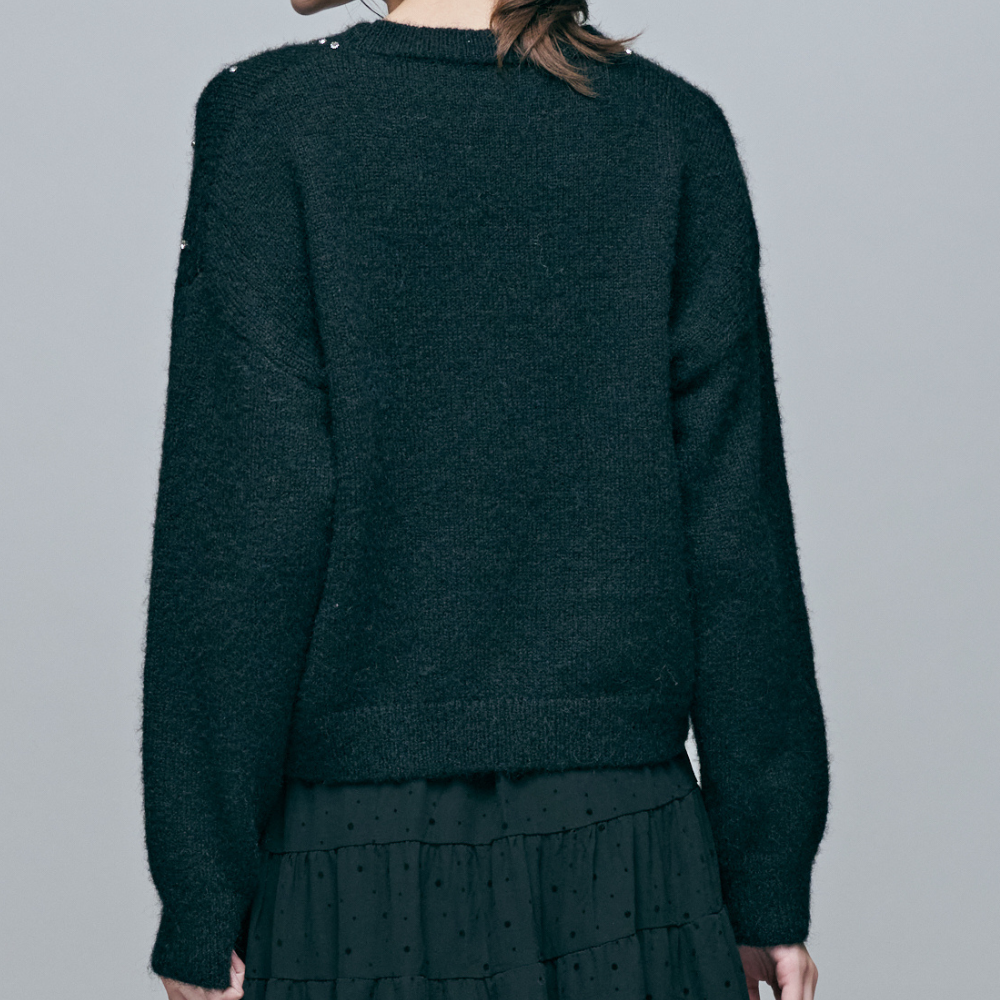 Starry Rhinestones 星光白鑽:領口與衣身均勻散佈著閃耀的 白鑽裝飾,在深色底布的襯托下,彷彿夜空中閃爍的繁星,讓整個人自帶柔光濾鏡。