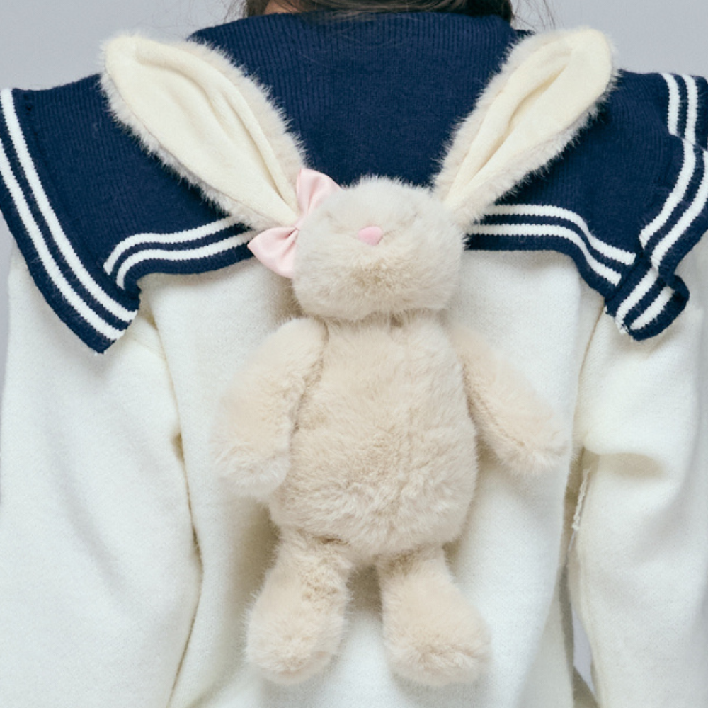 65%棉混紡親膚針織 / 甜美波浪邊海軍領 / 超吸睛活動式巨大兔兔 / 學院風條紋領結 / 右後質感LOGO印花