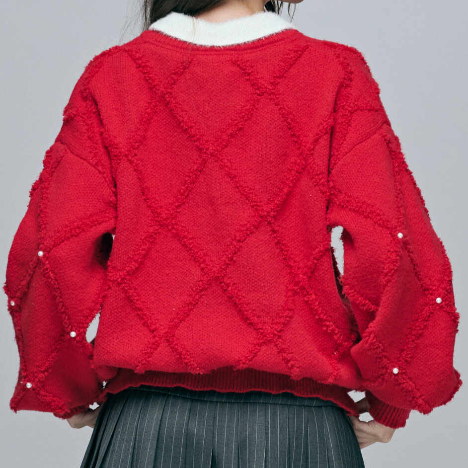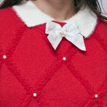 溫軟細緻包芯紗 / 經典立體菱格紋緹花 / 手工精緻珍珠點綴 / 撞色毛絨領片與品牌雙獅吊飾