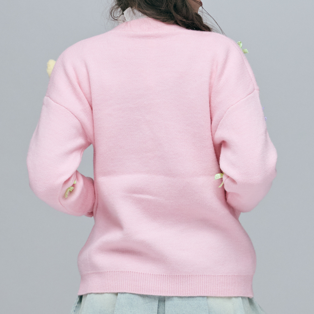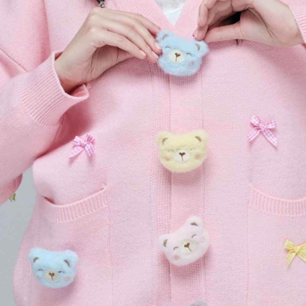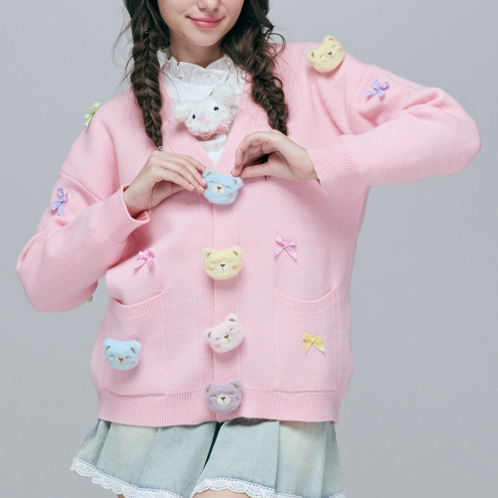 65%亞克力混紡含棉柔軟針織 / 夢幻粉色立體小熊與兔兔 / 門襟活動式大白熊頭 / 精緻粉色寶石釦 / 甜美跳色蝴蝶結