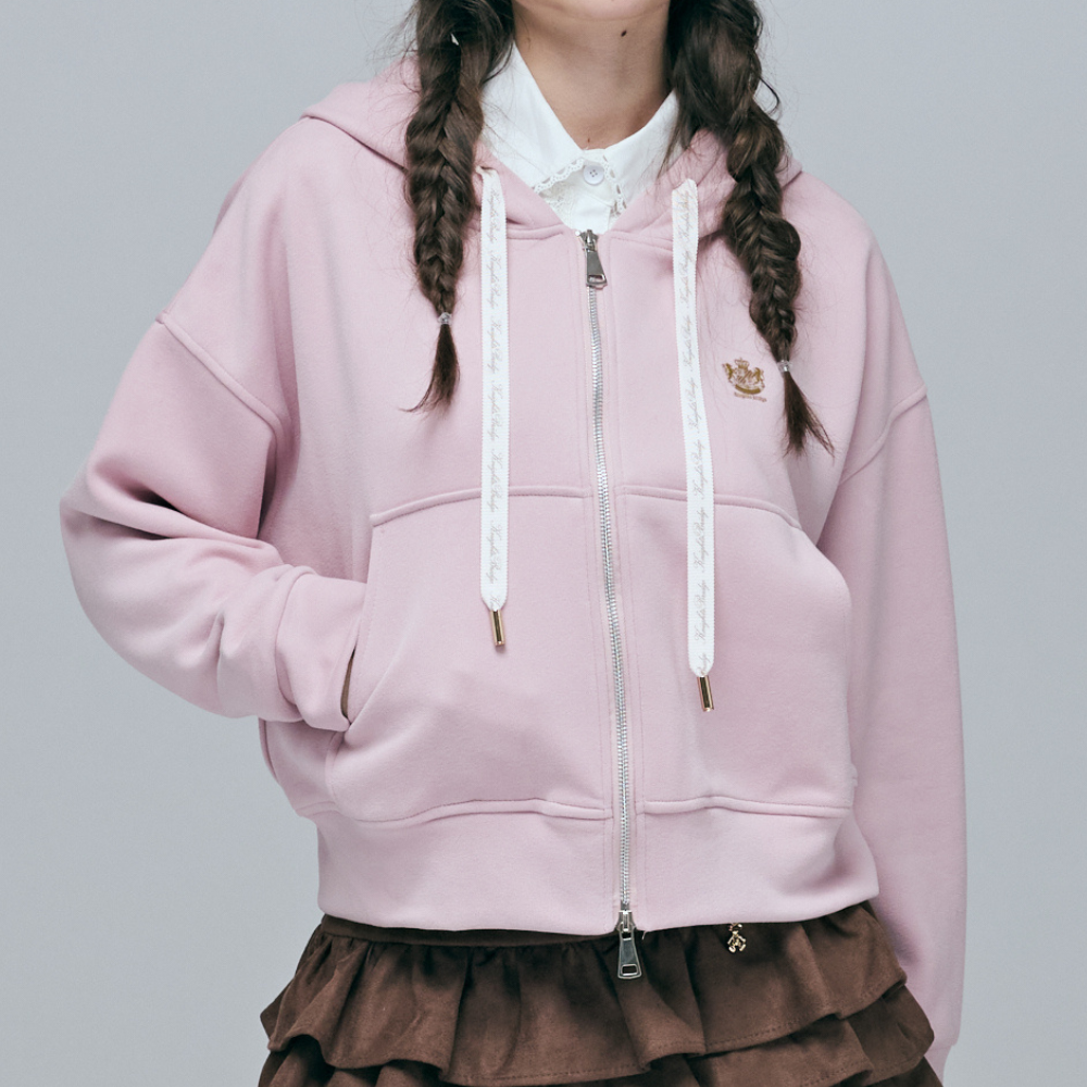 舒適親膚柔軟衛衣布 / 實用時尚前門襟雙開拉鍊 / 15mm寬版LOGO織帶帽繩 / 精緻圓柱五金與立體雙獅標 / 甜美粉嫩色系