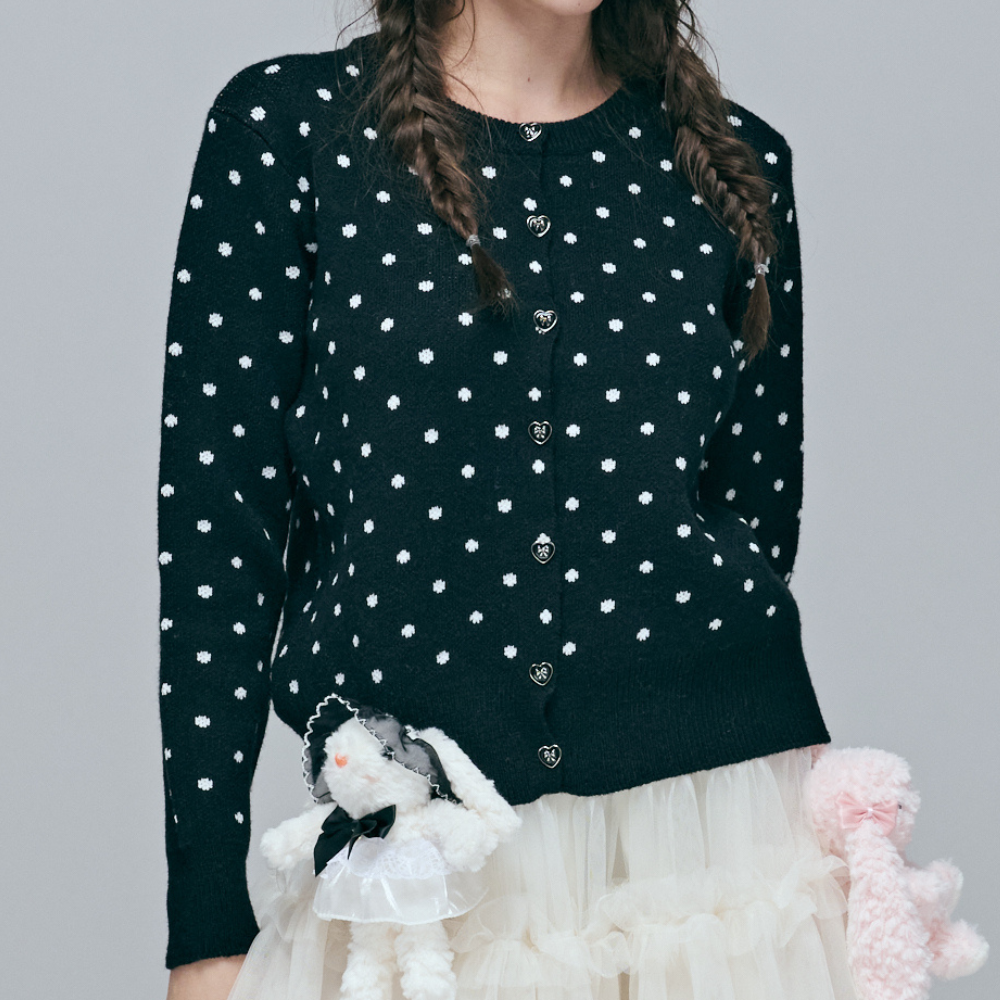 柔軟親膚尼龍混紡緹花 / 經典黑白波點圖騰 / 獨家活動式蘿莉小兔公仔 / 甜美愛心造型金屬釦 / 實穿小圓領版型