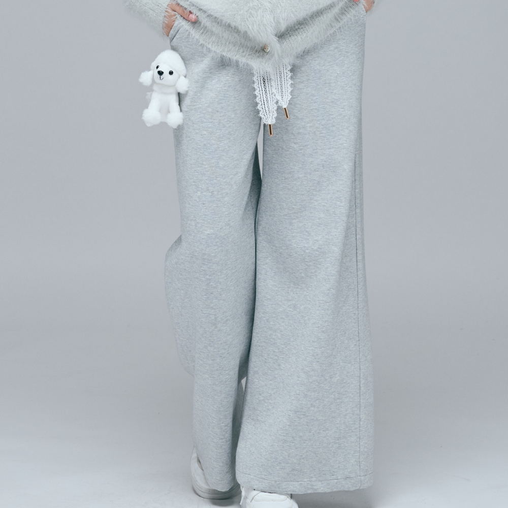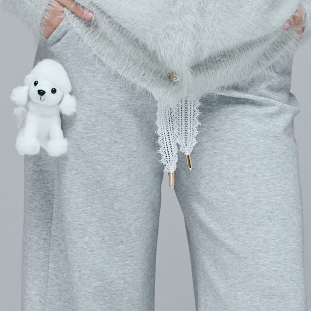 這款寬版休閒褲不僅擁有極佳的穿著彈性,更在細節處展現巧思。標誌性的立體貴賓狗玩偶裝飾於口袋旁,搭配精緻的蕾絲質感抽繩與金屬頭設計,讓休閒運動風瞬間升級為甜美時尚,是居家或外出逛街的吸睛單品。