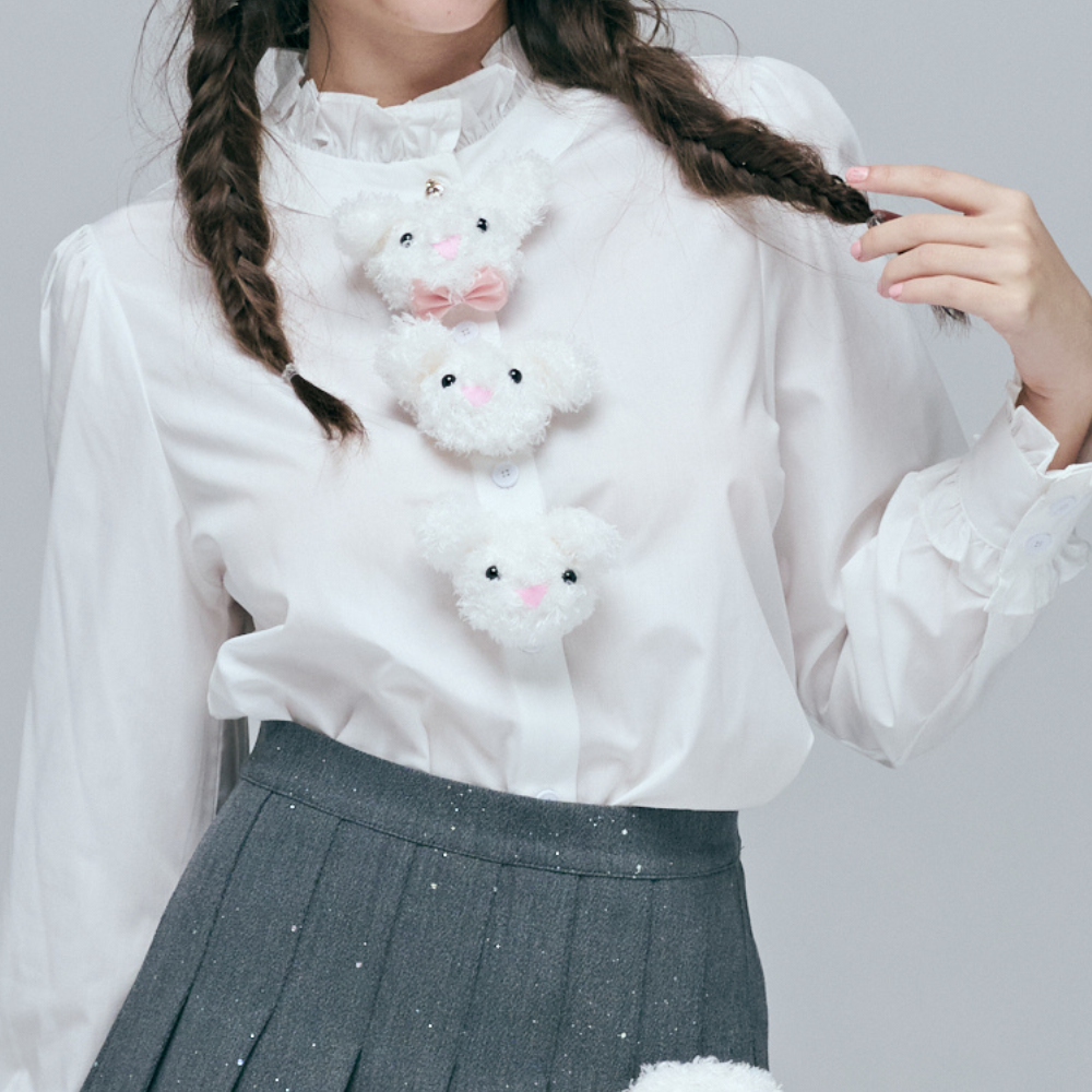 65%棉混紡硬挺襯衫布 / 甜美荷葉邊立領與袖口 / 療癒系活動立體兔頭 / 精緻立體熊熊釦 / 經典修身顯瘦版型