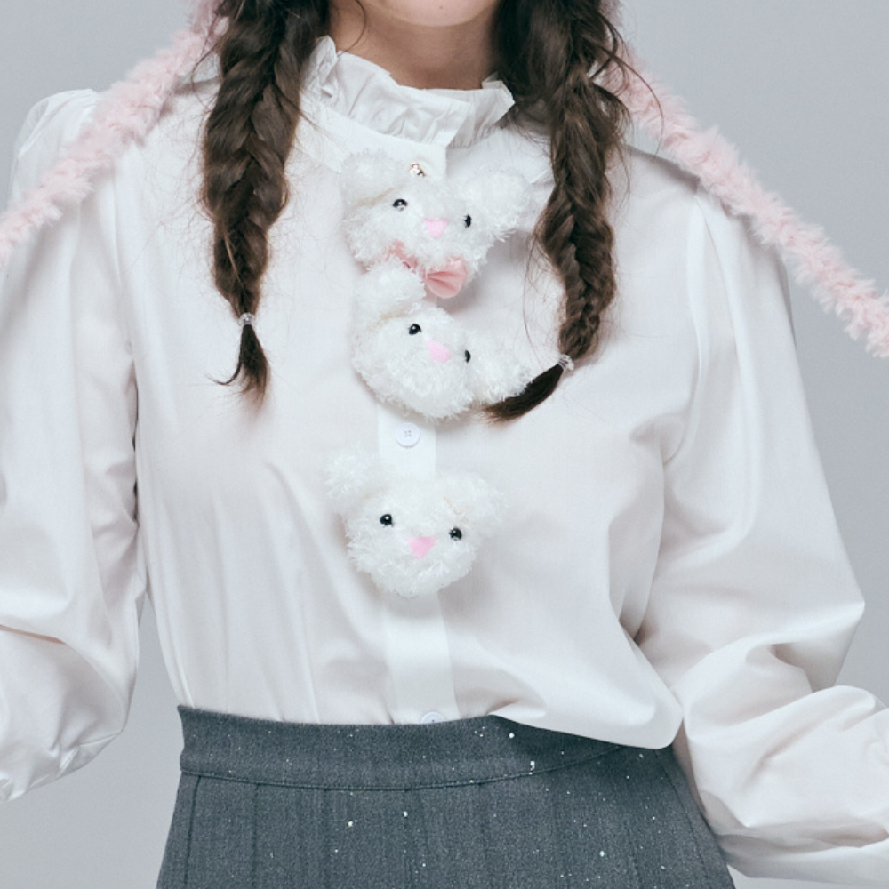 俏皮兔子魅力萌兔排站:門襟上裝飾著三隻超萌的立體毛絨兔頭,採活動式設計,可依場合自由感應。全部別上是夢幻少女,拆下則變身百搭的荷葉領襯衫。