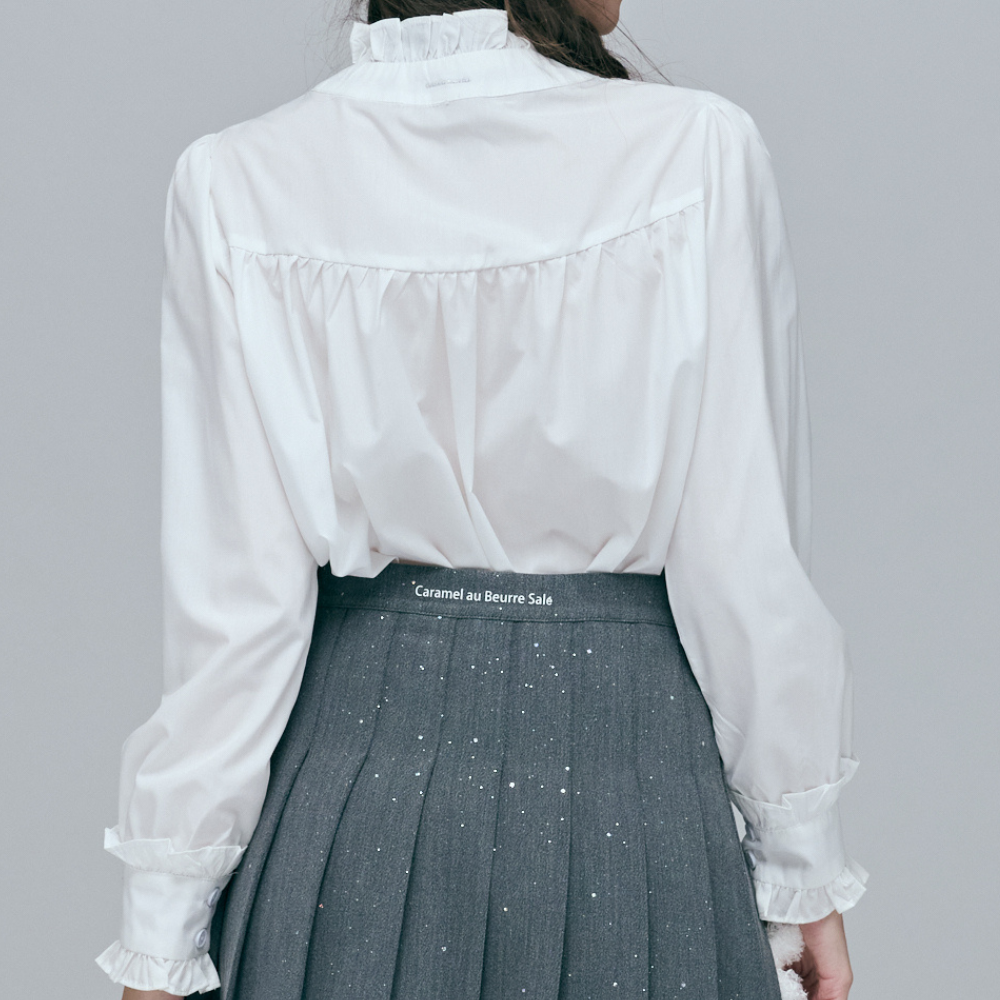 機洗建議:可機洗,建議扣好釦子、翻面並放入細網洗衣袋,避免荷葉邊被拉扯變形。