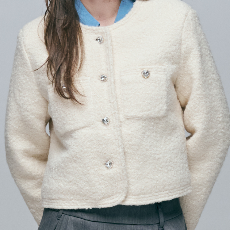 Heart Jewel Buttons 甜美亮點:前門襟特別選用閃耀的愛心造型鑽釦,將原本成熟優雅的小香風外套,瞬間注入了減齡的少女心。