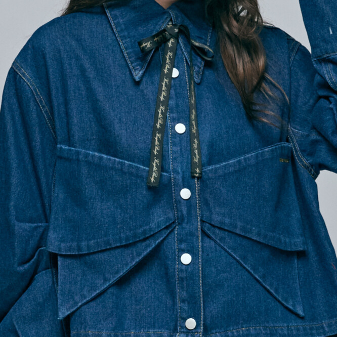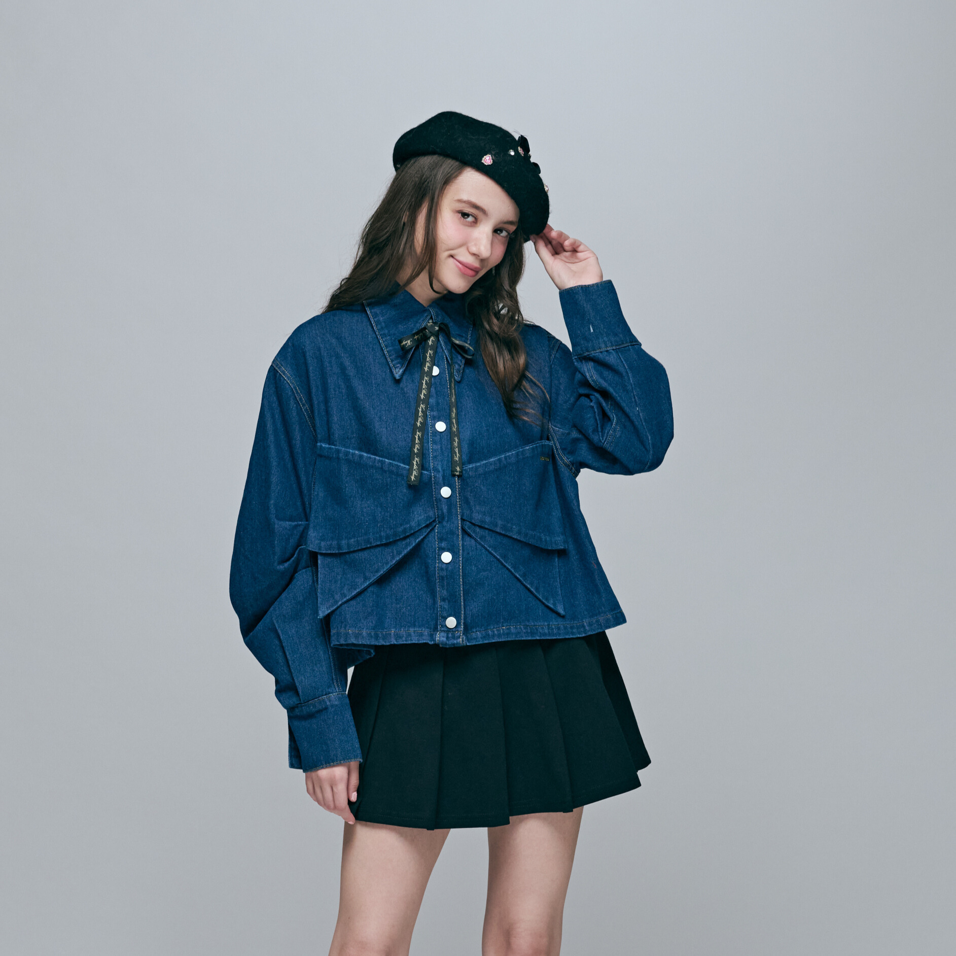 85%棉親膚水洗丹寧 / 門襟甜美大蝴蝶結設計 / 立體袖修飾手臂 / 附品牌LOGO織帶 / 顯瘦Hi-Line版型