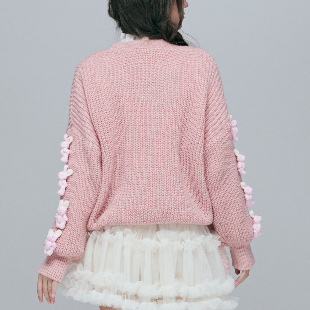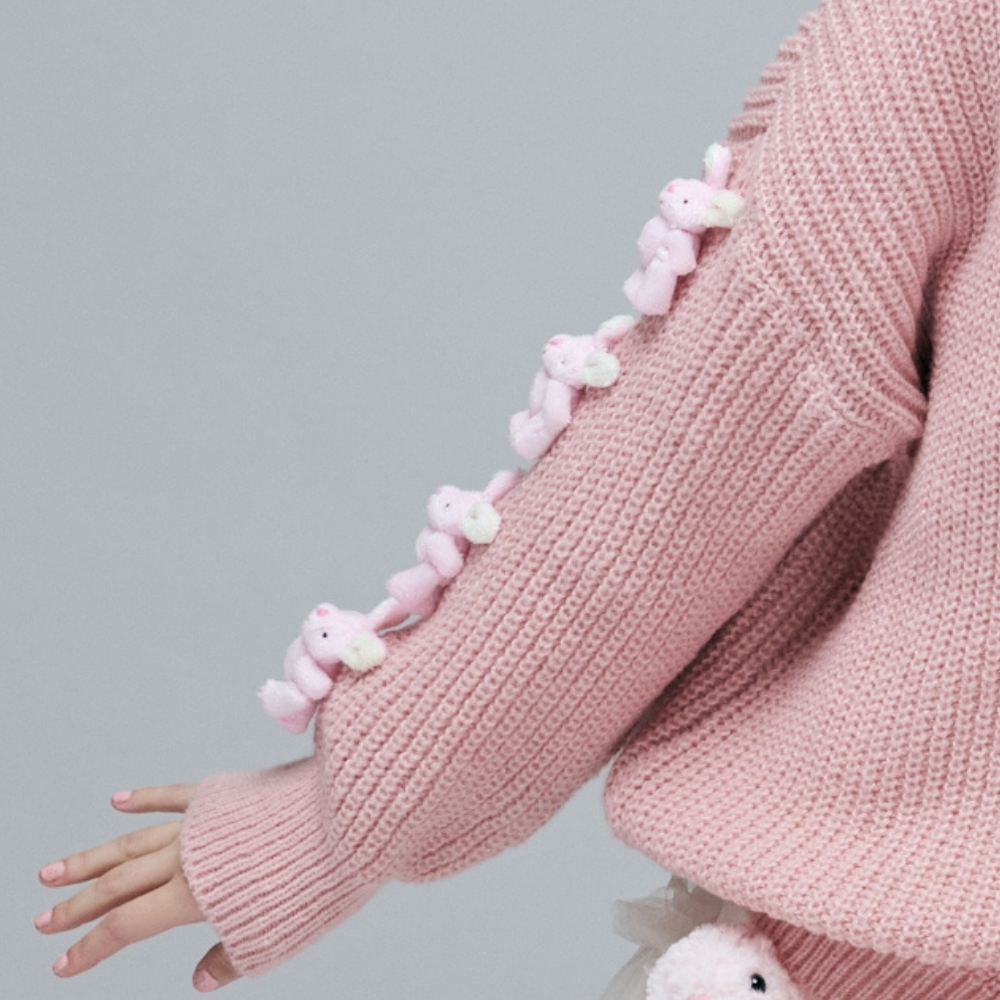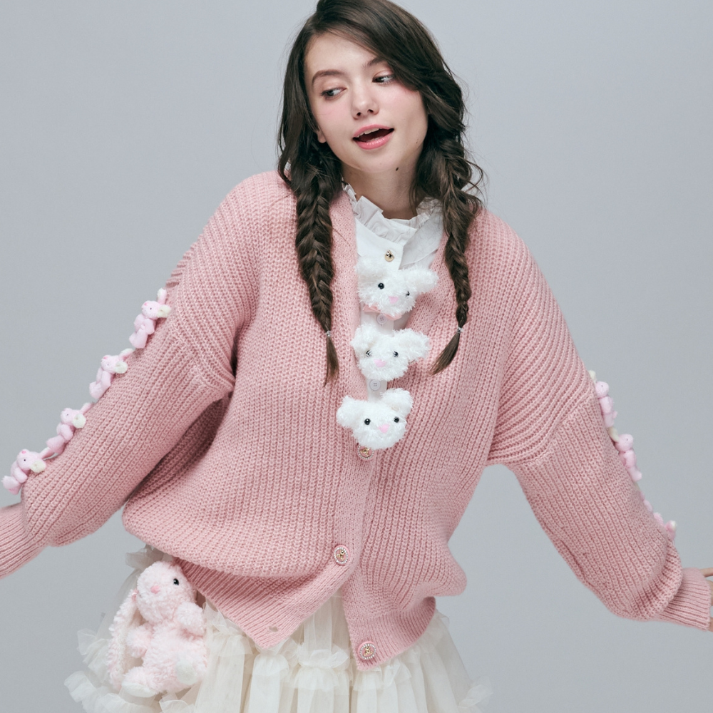 100%聚酯纖維柔軟粗針織 / 顯瘦寬鬆 V 領版型 / 療癒系活動式立體小兔 / 甜美粉嫩色系 / 年輕減齡穿搭
