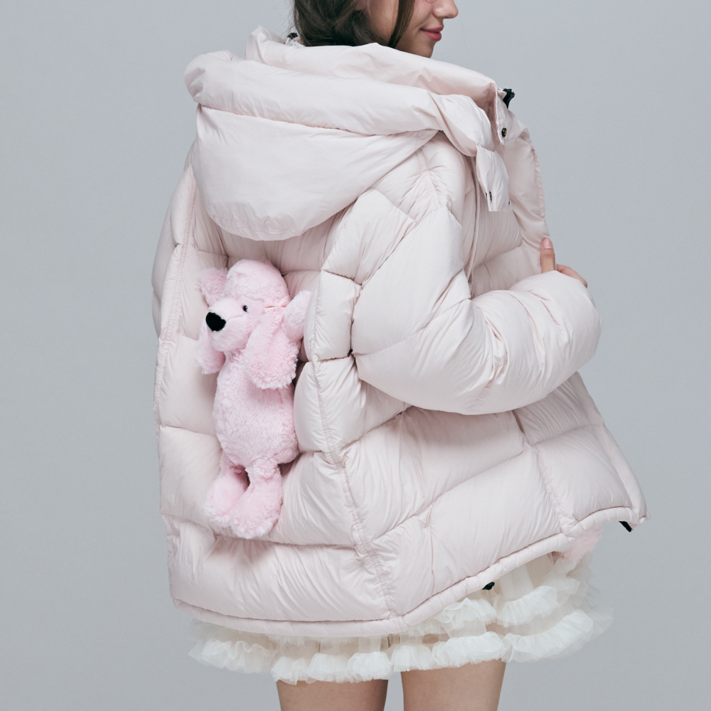 優質白鴨絨填充超輕保暖 / 療癒系活動式貴賓狗玩偶 / 左胸甜美冰淇淋 LOGO / 舒適透氣超輕羽絨 / 甜美可愛必備