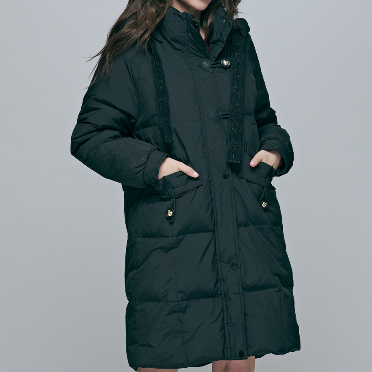 50%羽絨填充保暖 / 微防潑水機能布料 / 甜美 Lace 蕾絲壓紋帽繩 / 精緻立體熊熊釦 / 袖臂雙獅燙鑽標