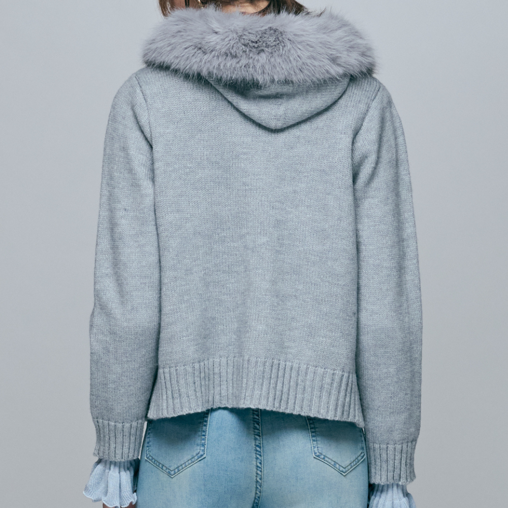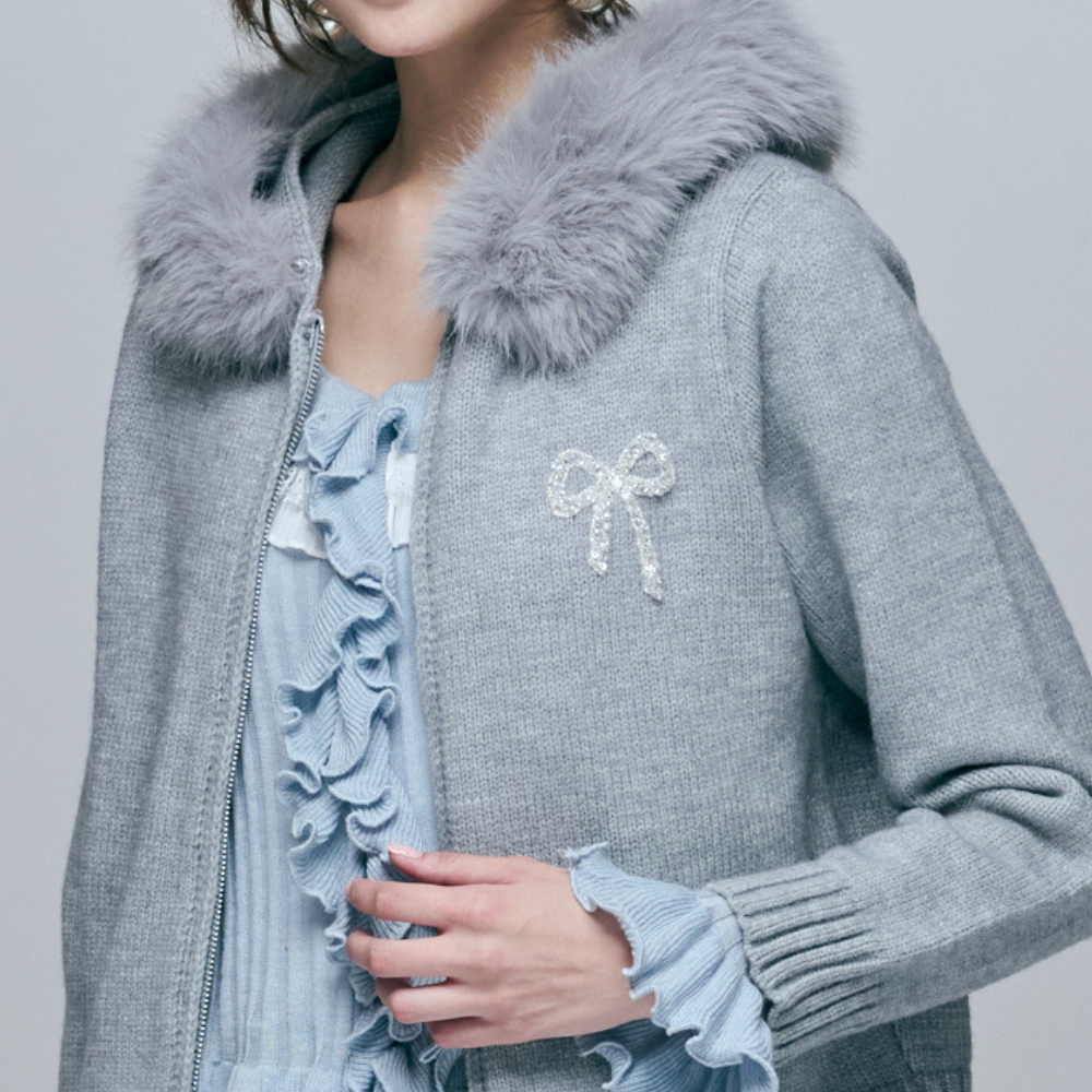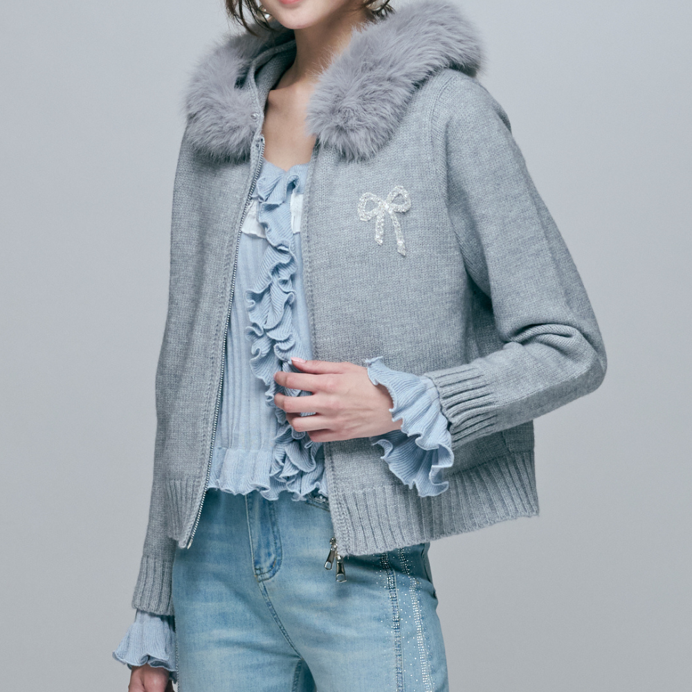 75%細支膨體紗+23%親膚螺縈 / 羊毛般蓬鬆保暖手感 / 奢華可拆式毛毛連帽 / 精緻水鑽蝴蝶結別針 / 顯瘦羅紋縮口下擺